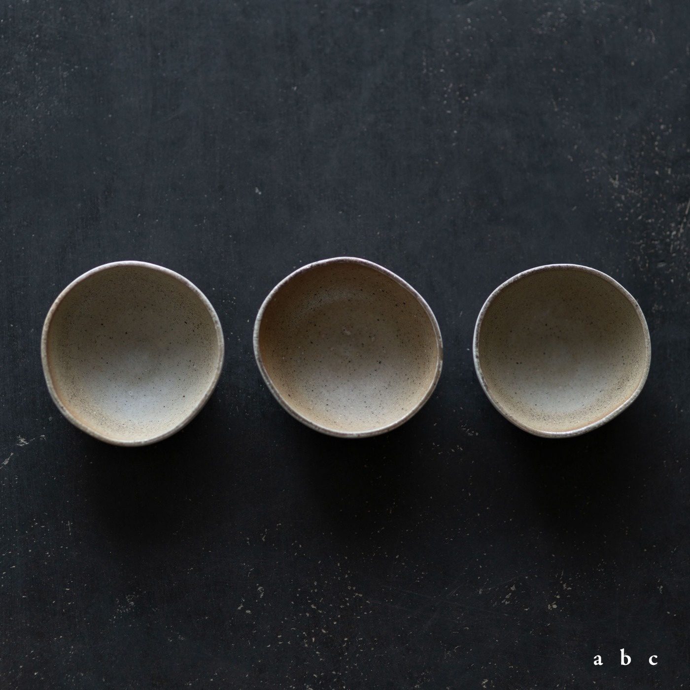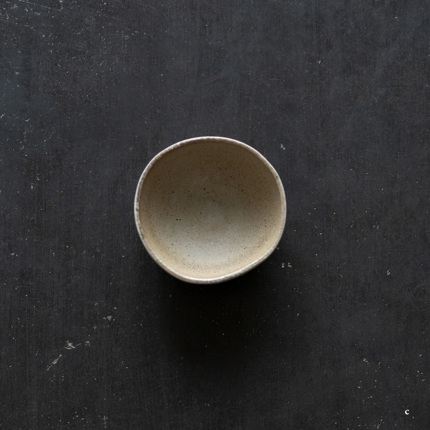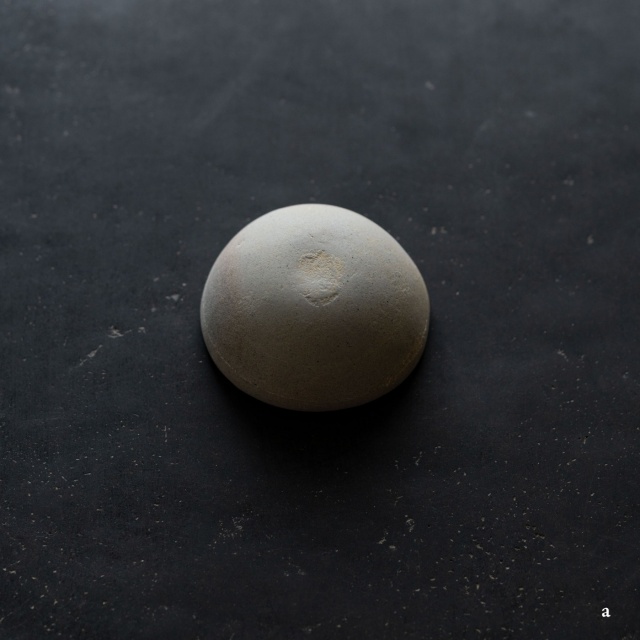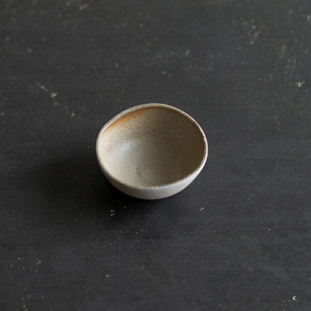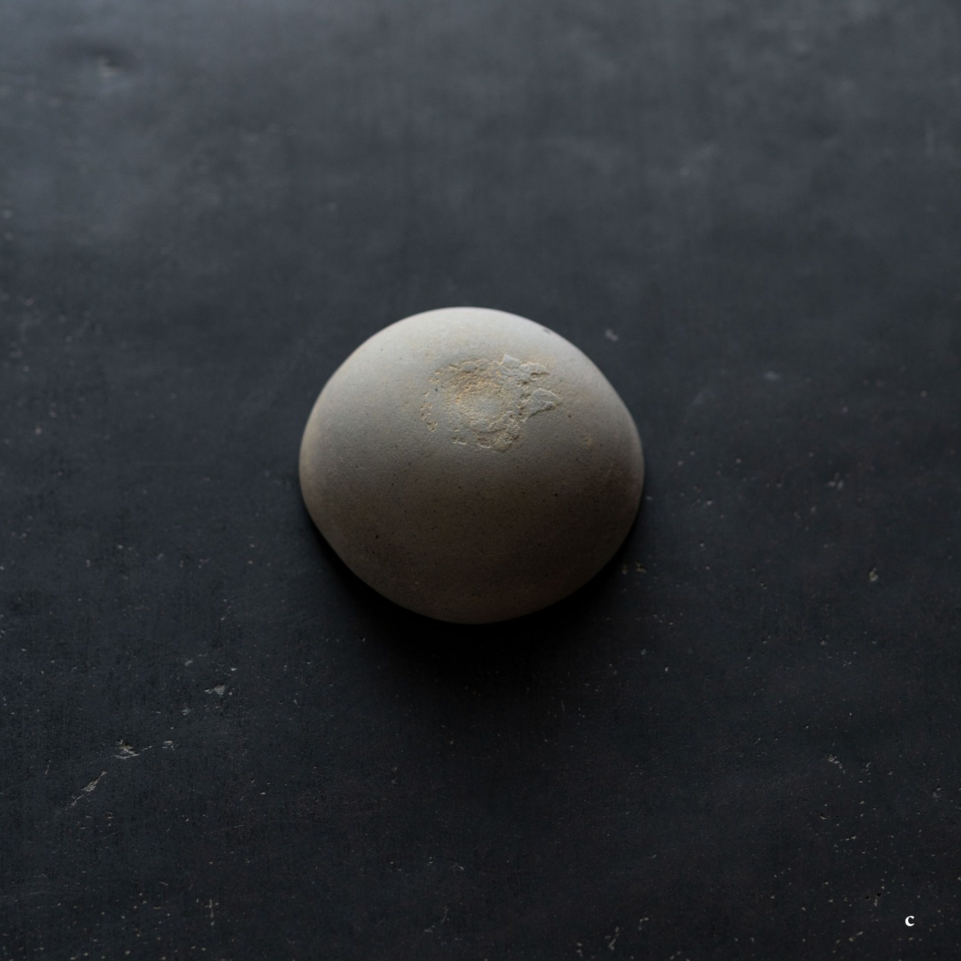 掌に心地よくおさまる器の丸みは、独自の手法”くぼみ”(砂いこみ)から生まれる形です。ろくろや手びねりで成形したものではなく、海岸で拾った丸い石などを使って、砂状のところにくぼみをつくり、そのくぼみに泥を流し込んで、くぼみを器に写すという手法で成形しています。一つのくぼみからつくるものは一つだけです。