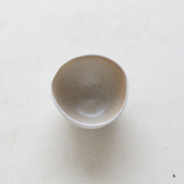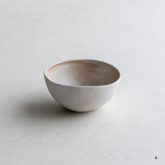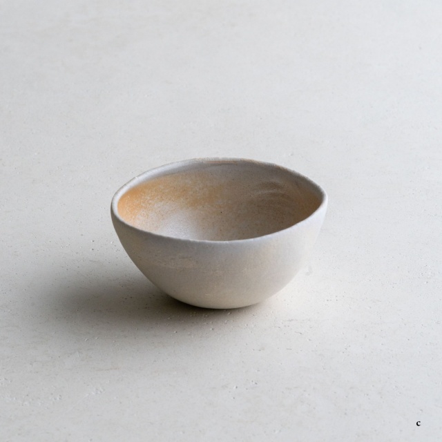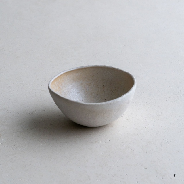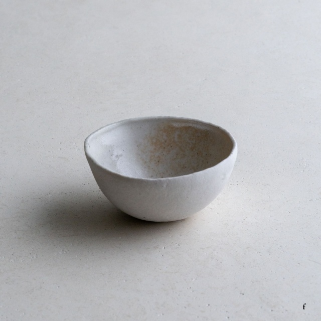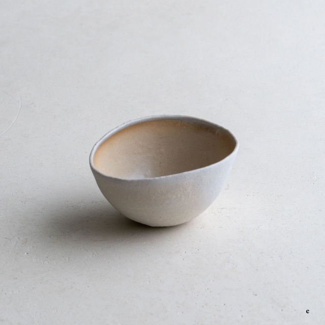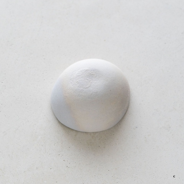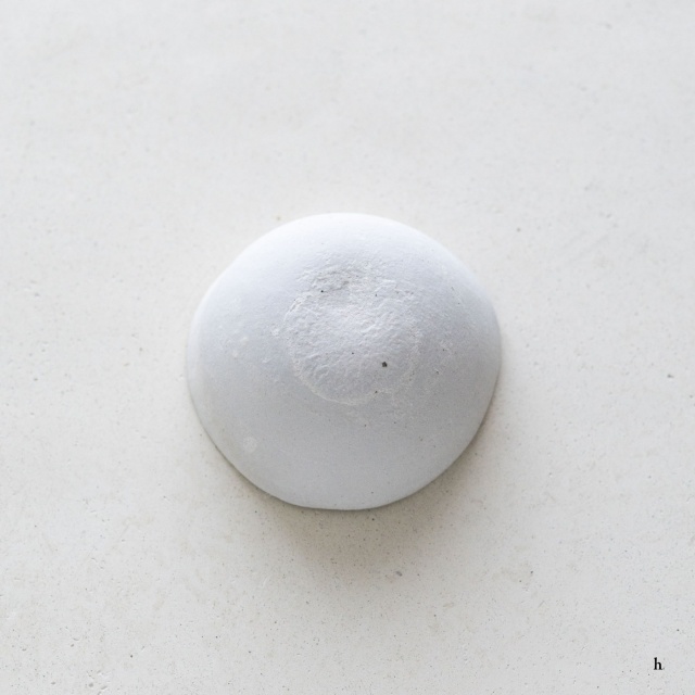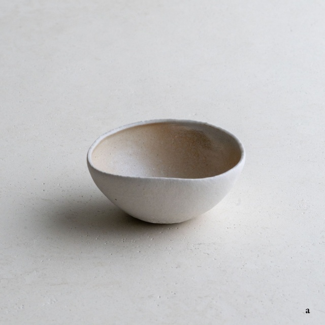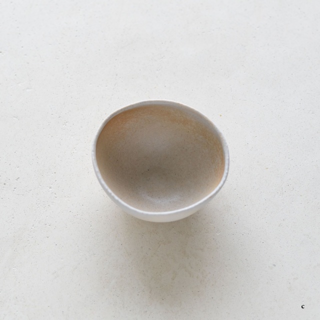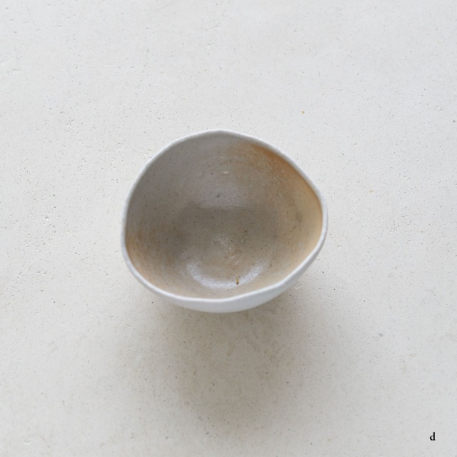 掌に心地よくおさまる器の丸みは、独自の手法”くぼみ”(砂いこみ)から生まれる形です。ろくろや手びねりで成形したものではなく、瓢箪や海岸で拾った丸い石を使って、砂状のところにくぼみをつくり、そのくぼみに泥を流し込んで、くぼみを器に写すという手法で成形しています。一つのくぼみからつくるものは一つだけです。