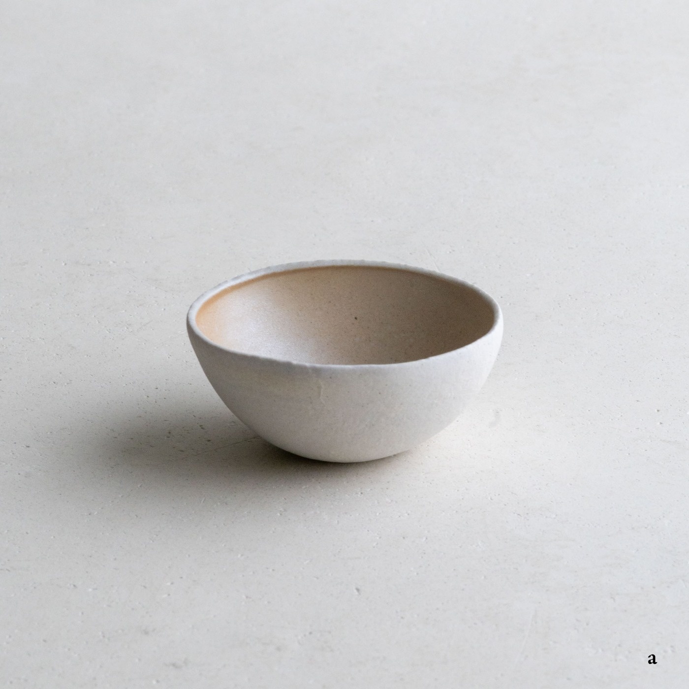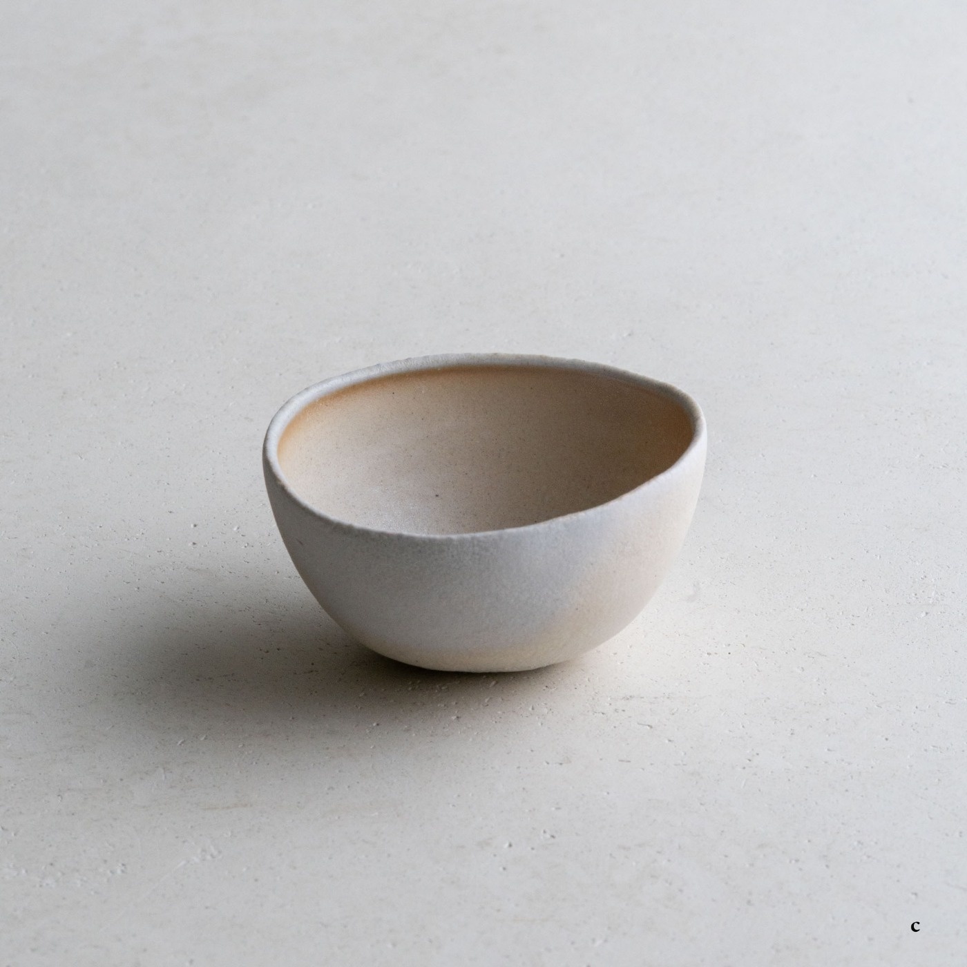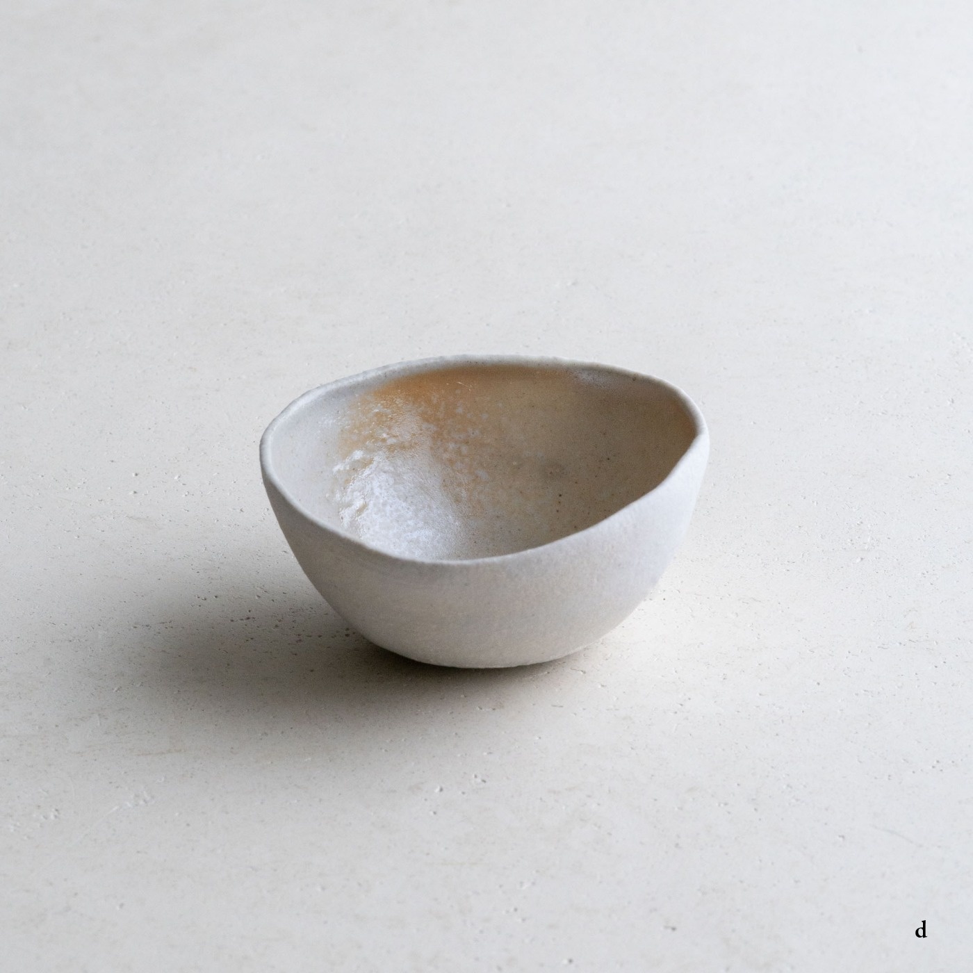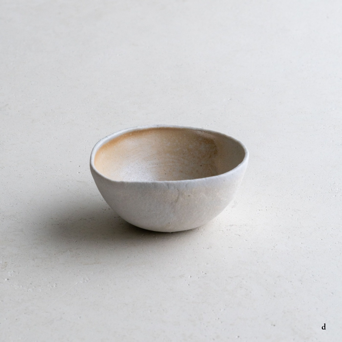掌に心地よくおさまる器の丸みは、独自の手法”くぼみ”(砂いこみ)から生まれる形です。ろくろや手びねりで成形したものではなく、瓢箪や海岸で拾った丸い石を使って、砂状のところにくぼみをつくり、そのくぼみに泥を流し込んで、くぼみを器に写すという手法で成形しています。一つのくぼみからつくるものは一つだけです。