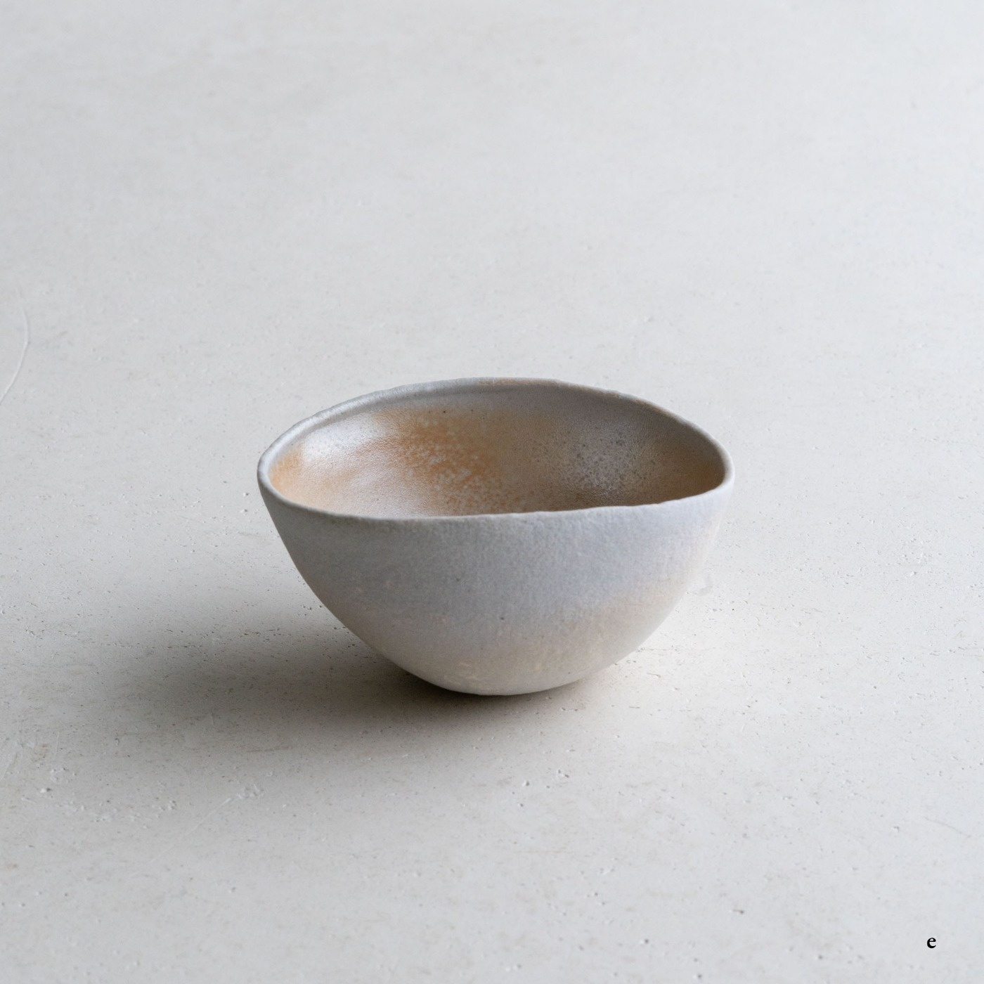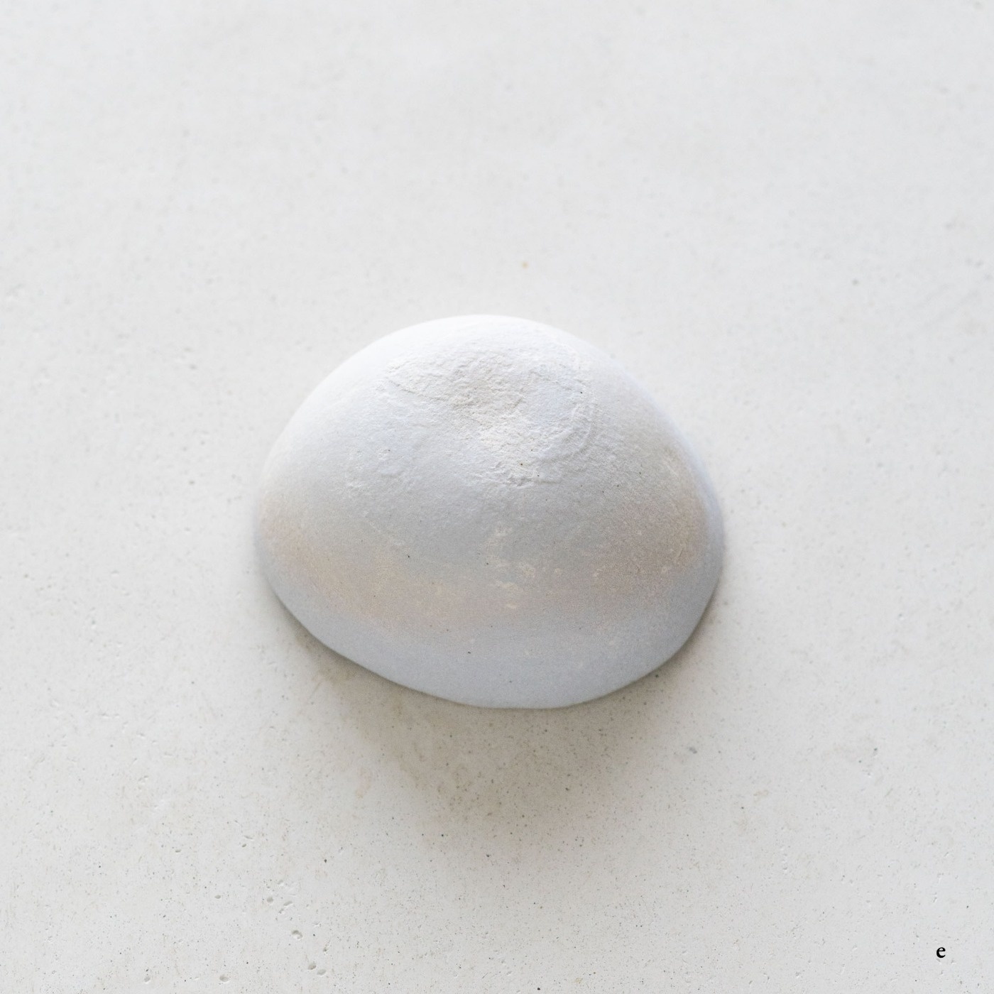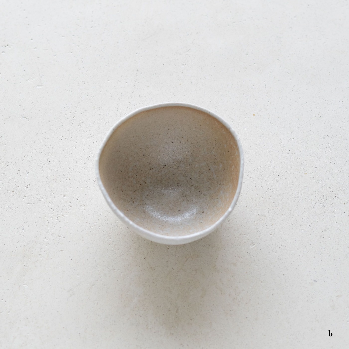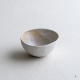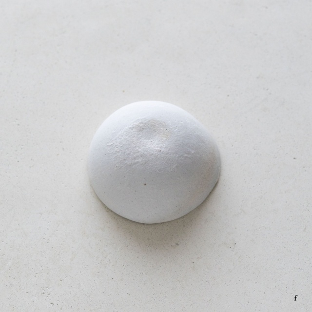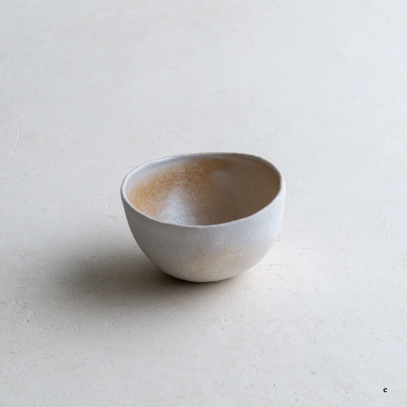 掌に心地よくおさまる器の丸みは、独自の手法”くぼみ”(砂いこみ)から生まれる形です。ろくろや手びねりで成形したものではなく、瓢箪や海岸で拾った丸い石を使って、砂状のところにくぼみをつくり、そのくぼみに泥を流し込んで、くぼみを器に写すという手法で成形しています。一つのくぼみからつくるものは一つだけです。