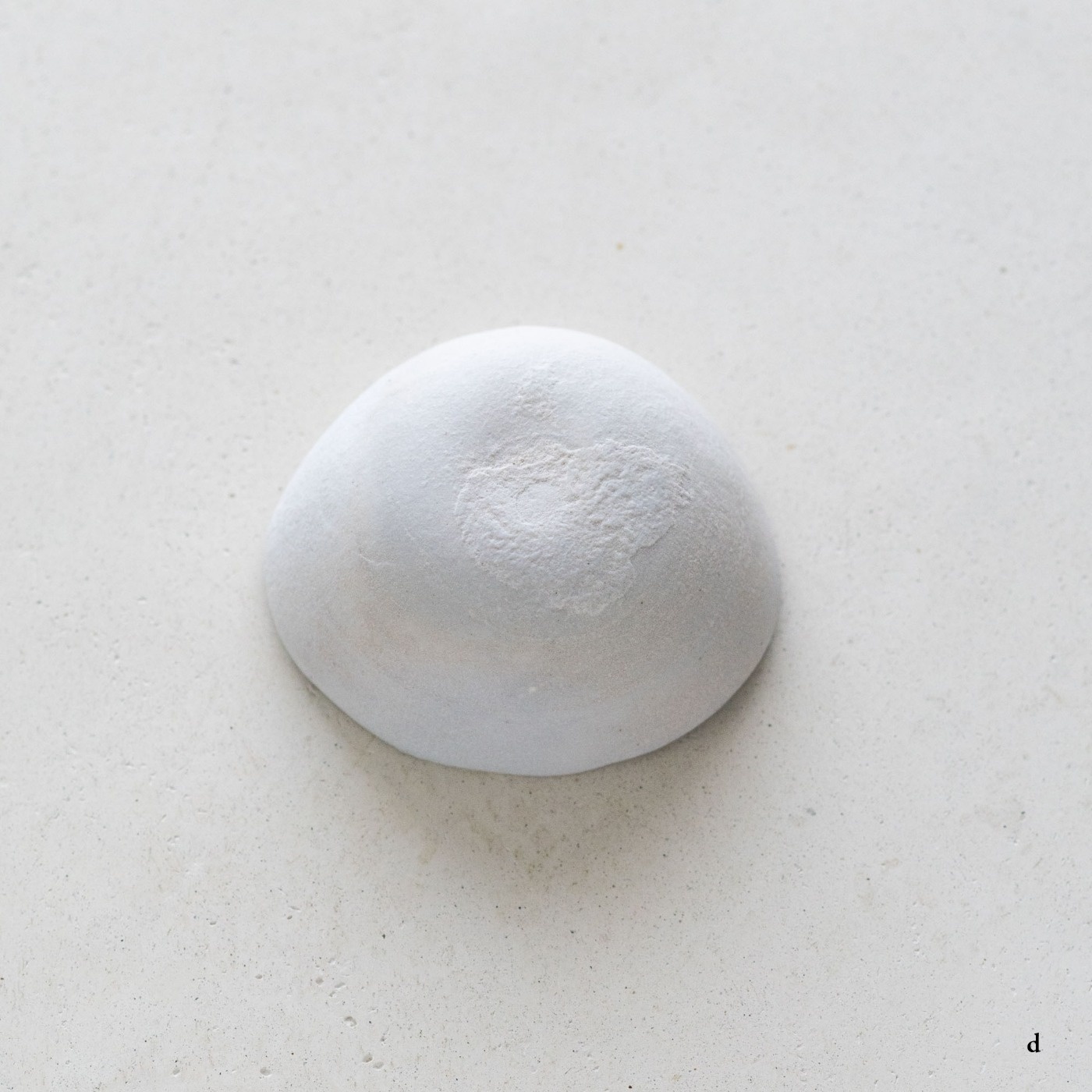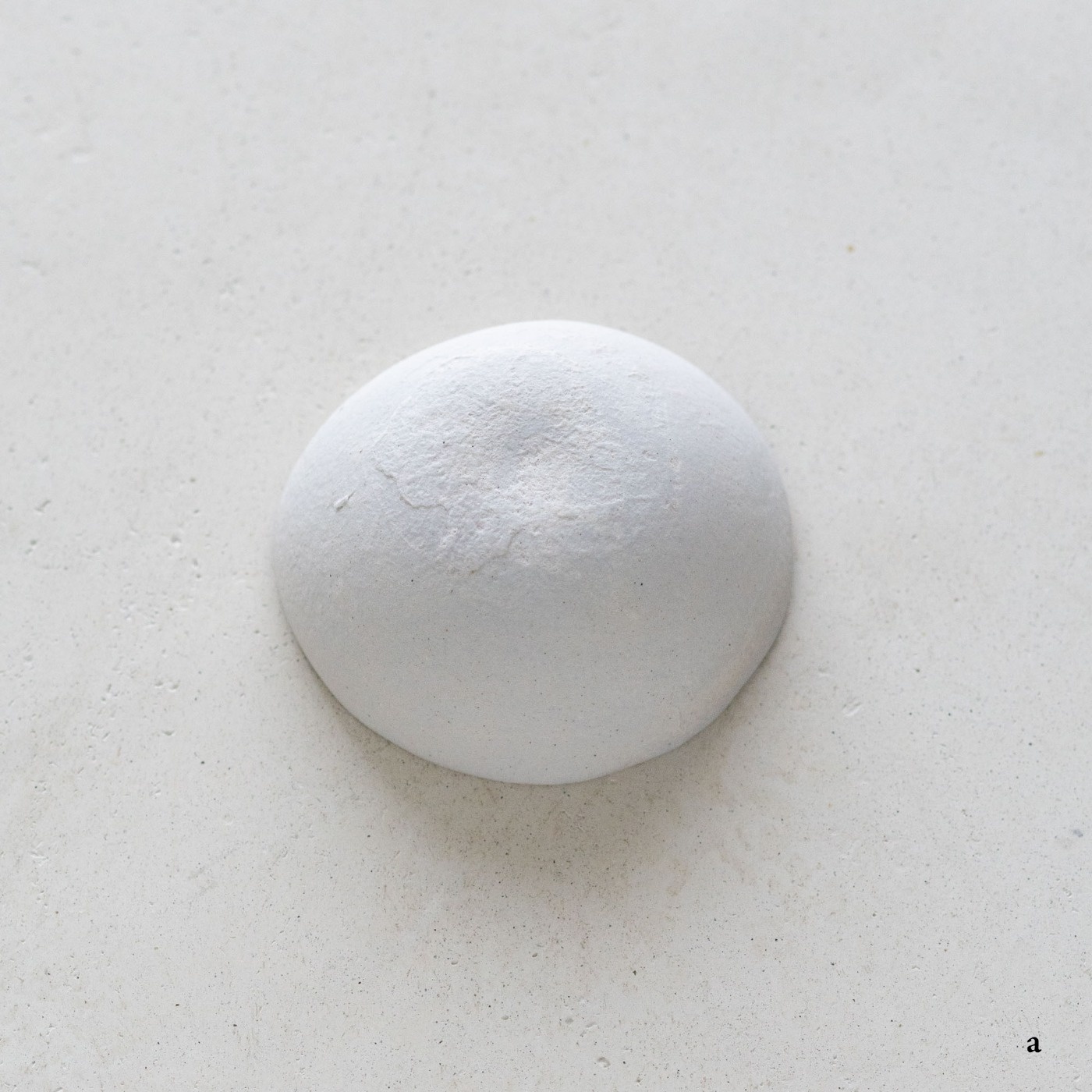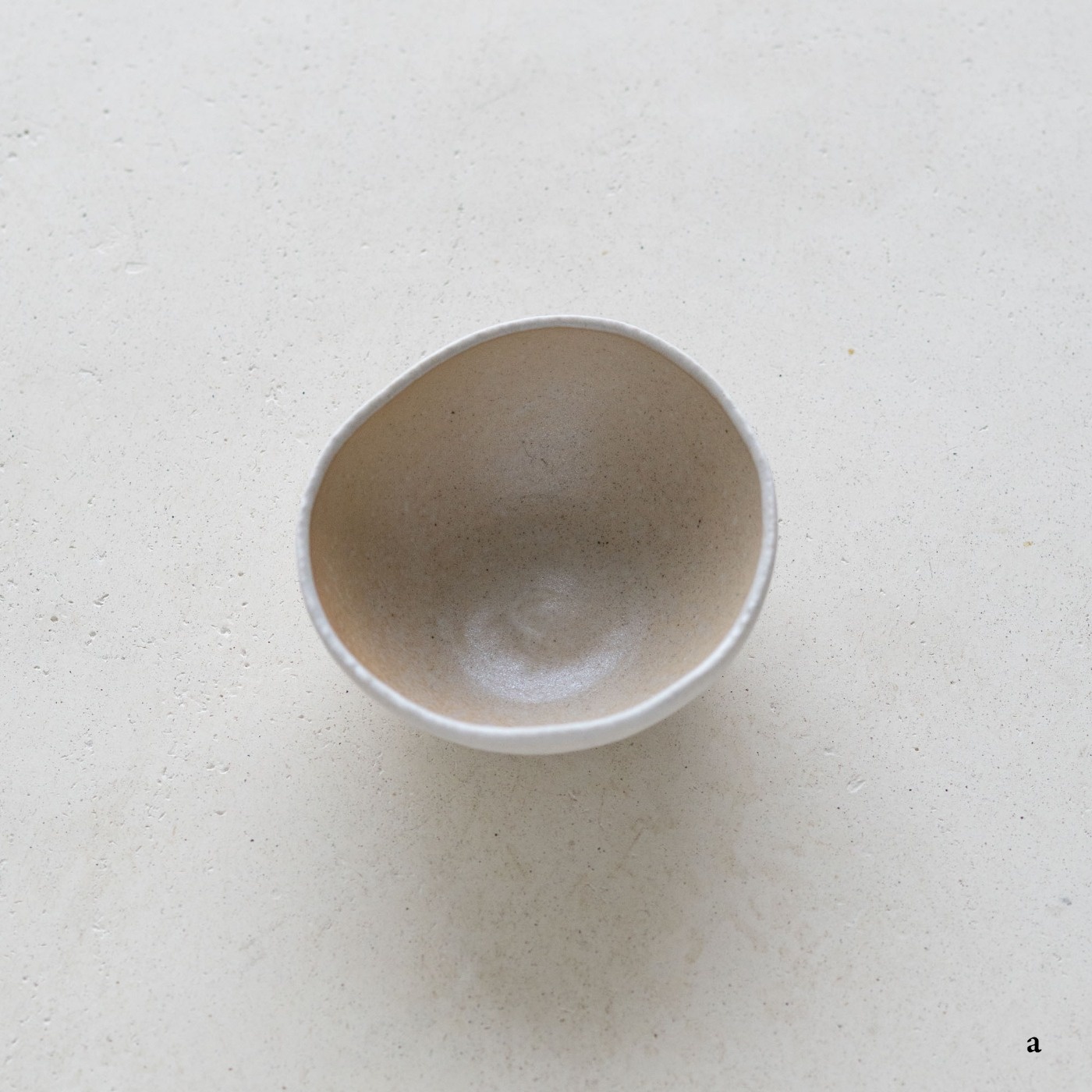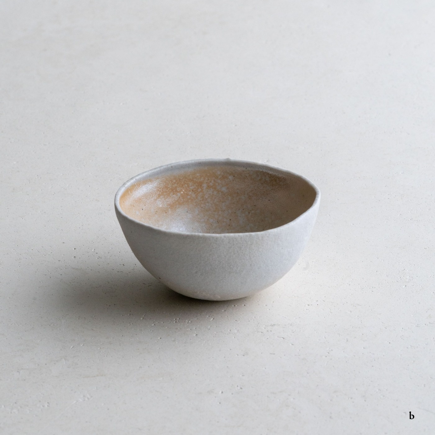 掌に心地よくおさまる器の丸みは、独自の手法”くぼみ”(砂いこみ)から生まれる形です。ろくろや手びねりで成形したものではなく、瓢箪や海岸で拾った丸い石を使って、砂状のところにくぼみをつくり、そのくぼみに泥を流し込んで、くぼみを器に写すという手法で成形しています。一つのくぼみからつくるものは一つだけです。