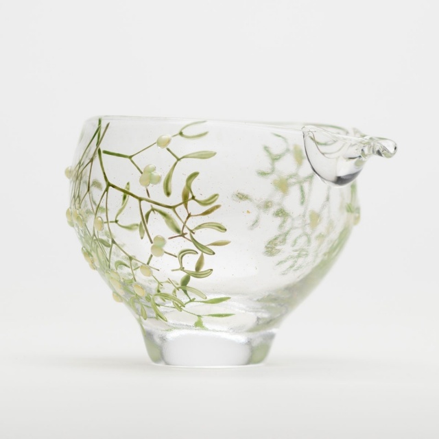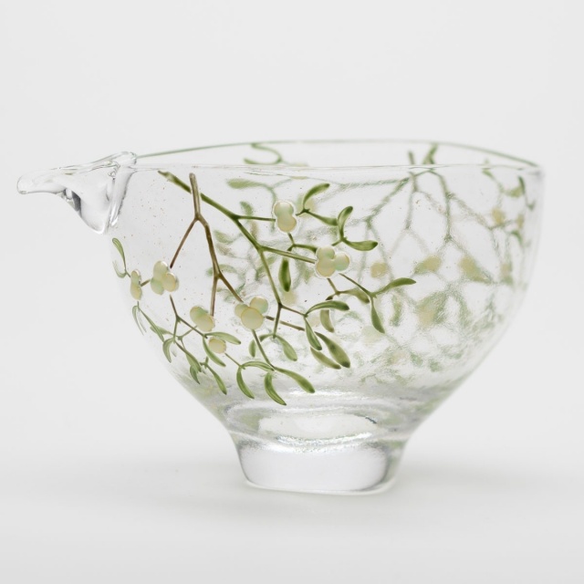 落葉高木の樹上に寄生して育つヤドリギ。「まるで工芸品のような完成された美しさをもつ不思議な植物。最初の葉を出すまでに3年半もかかるそうで、冬になって葉が落ちた高い木の上にヤドリギを見つけると、長い時間をかけて成長したのね…と嬉しくなります」と藤井さん。実の部分を有線七宝で高く盛って焼き付け、葉は外側と内側の両方に絵付けをして、独特な葉のひろがりや重なりを表現しています。
